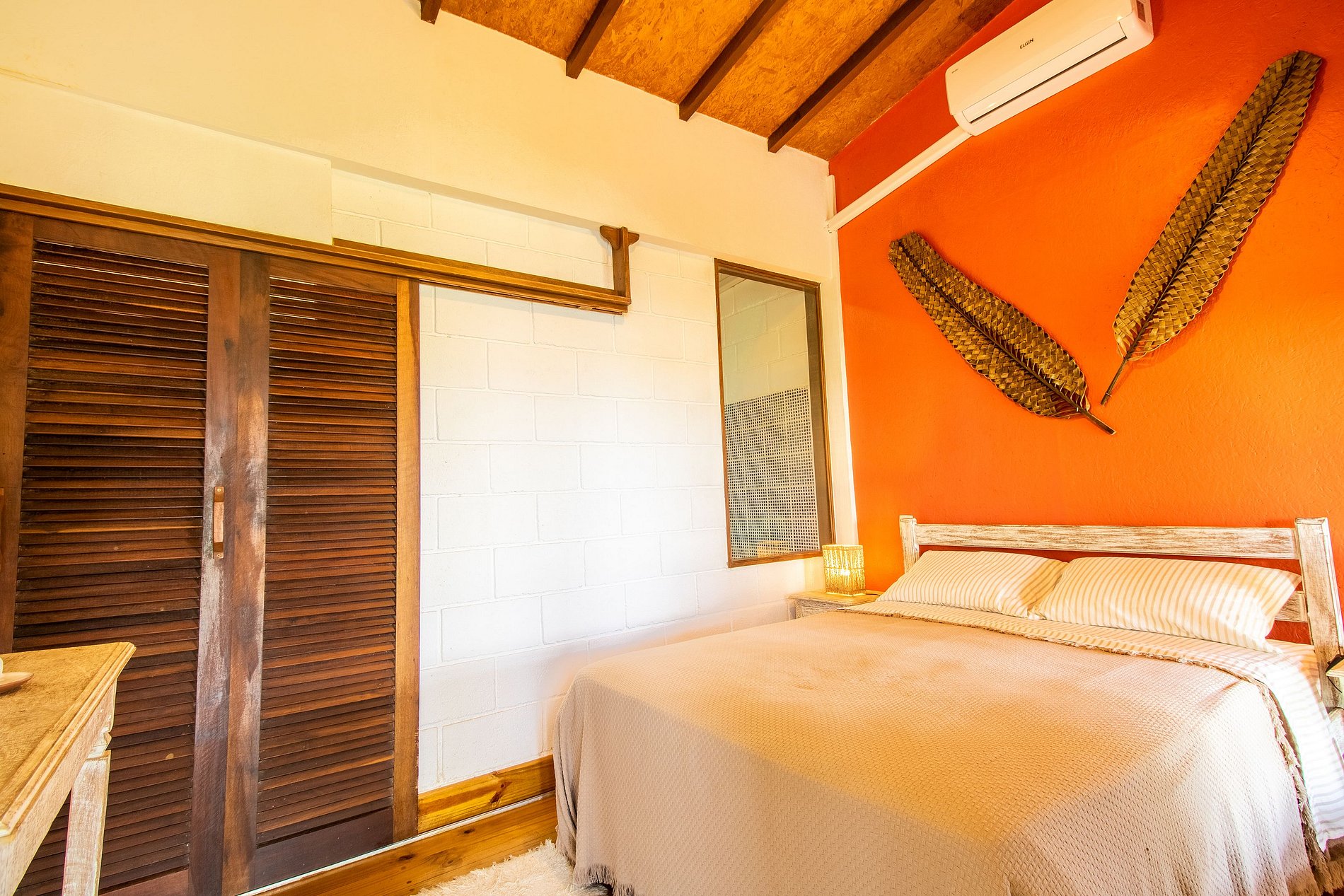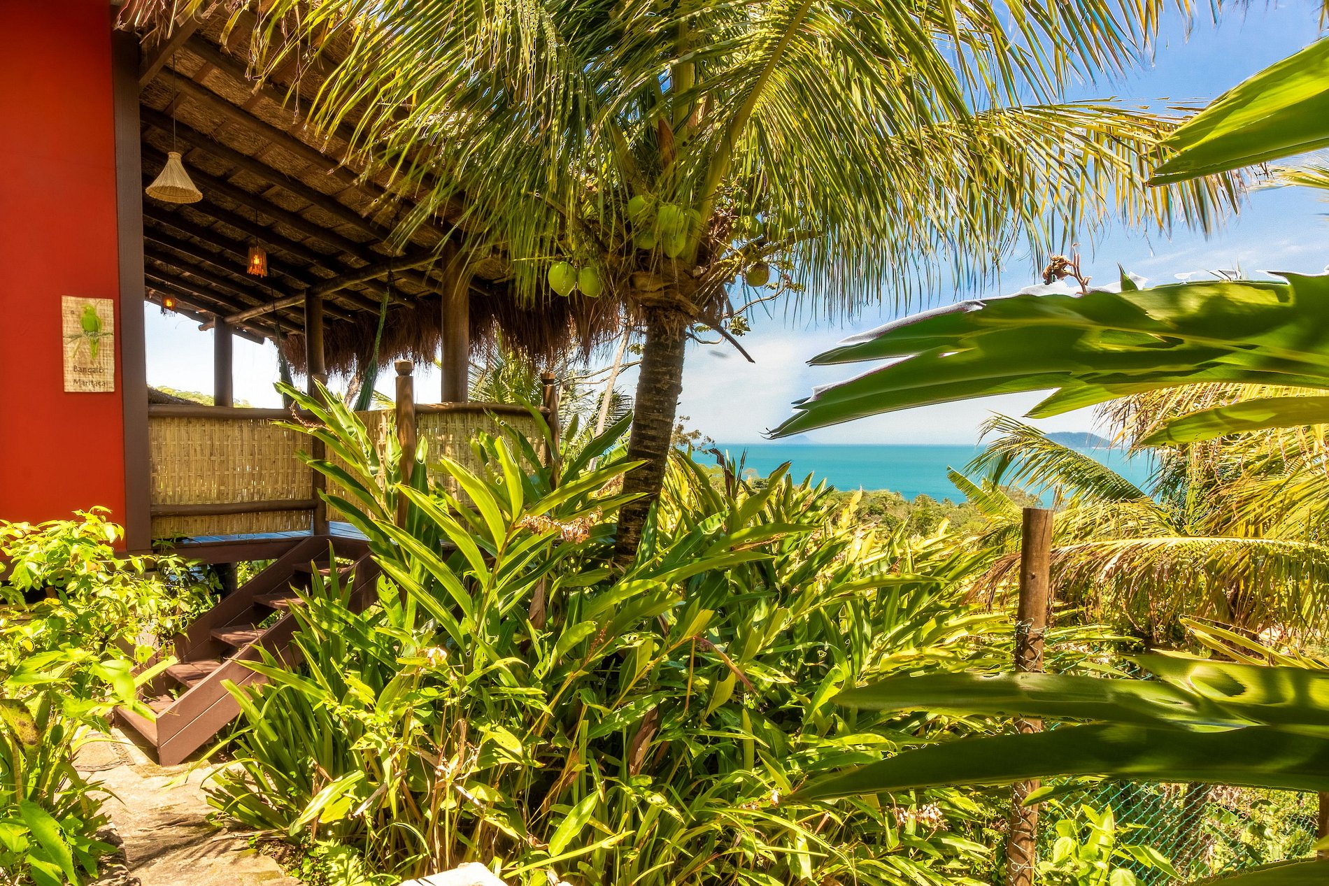 • Arquitetura de madeira, com uma ampla varanda na frente e telhado generoso, para trazer conforto térmico. O Bangalô está completamente imerso na Mata Atlântica, cercado por coqueiros, bananeiras e outras árvores.