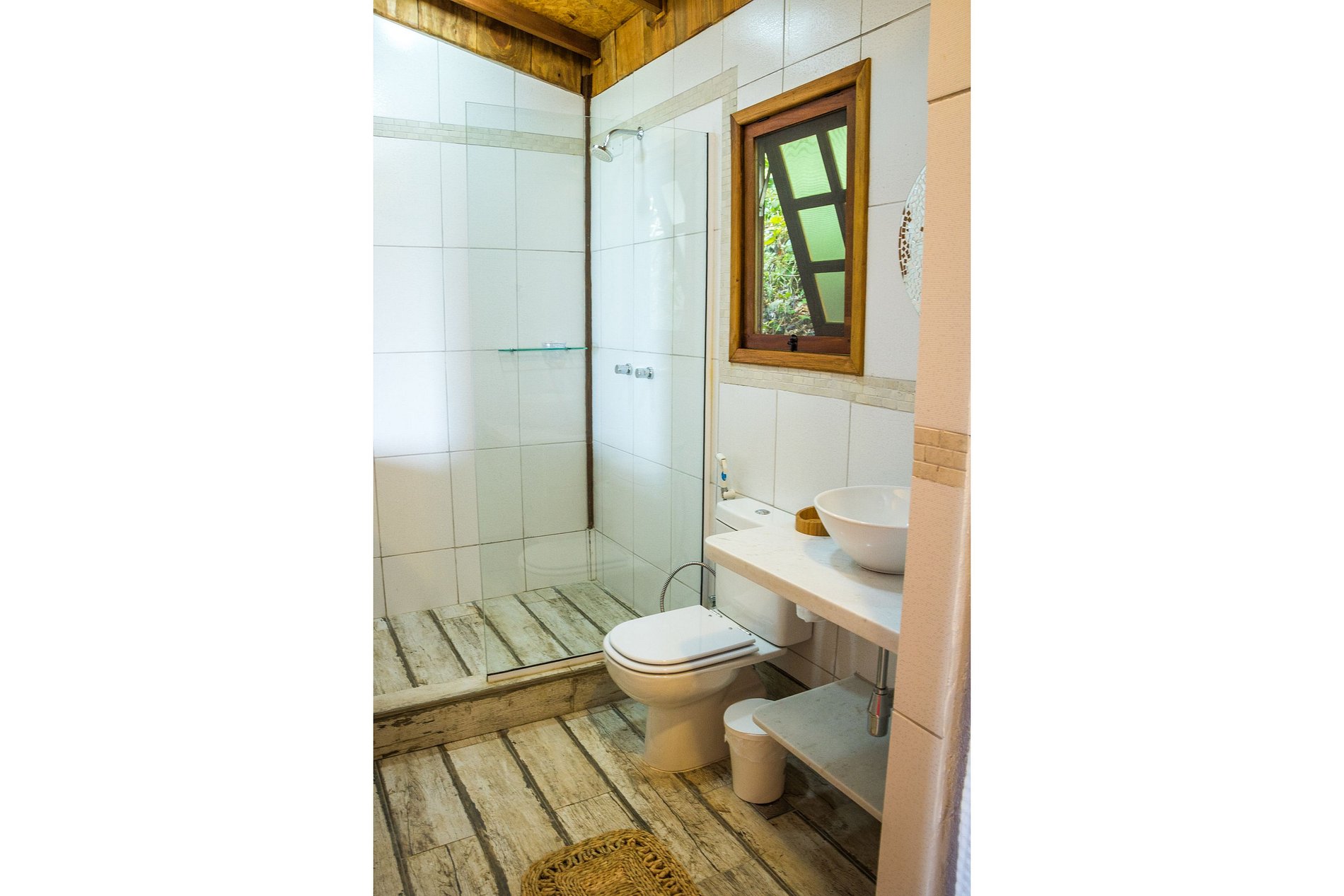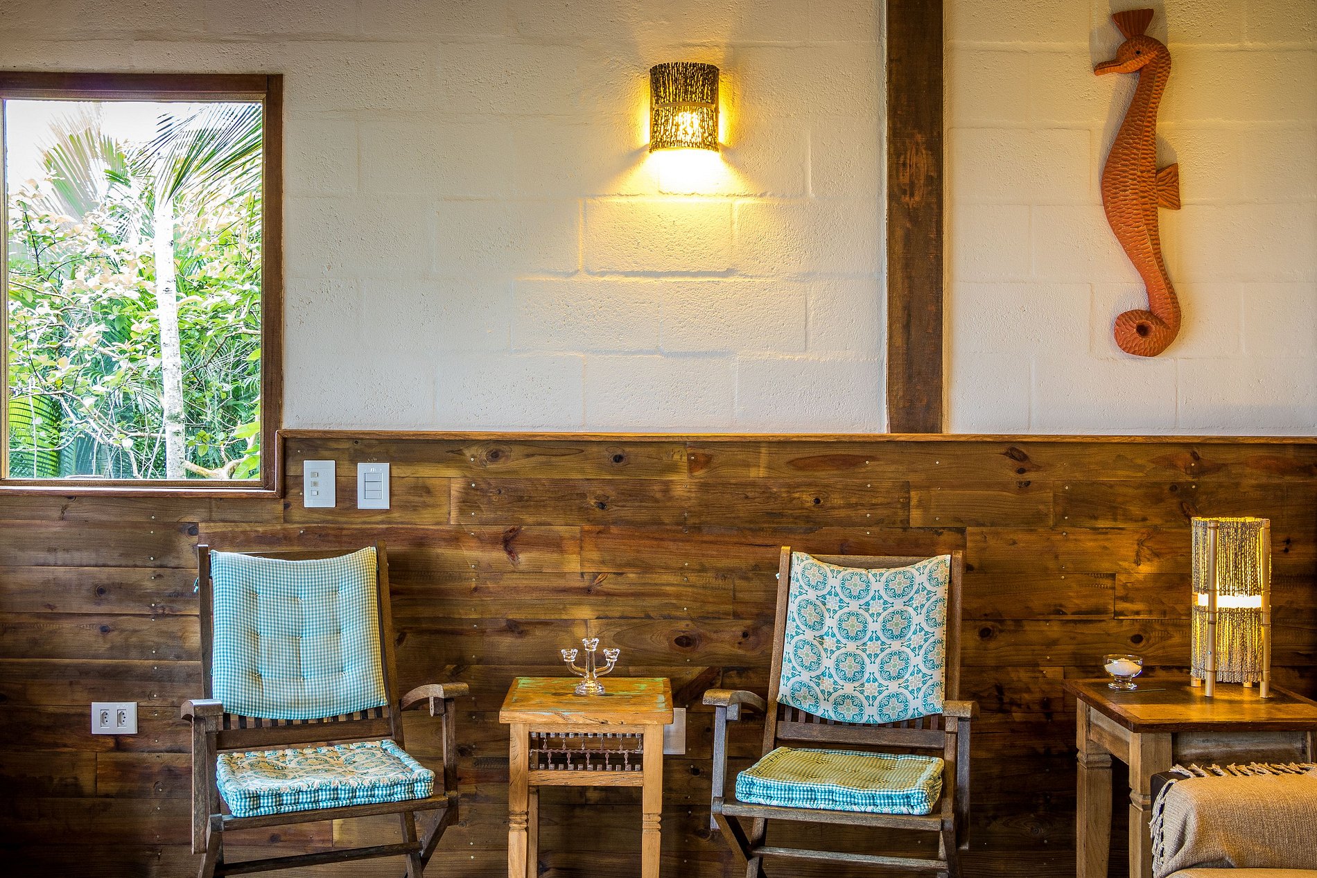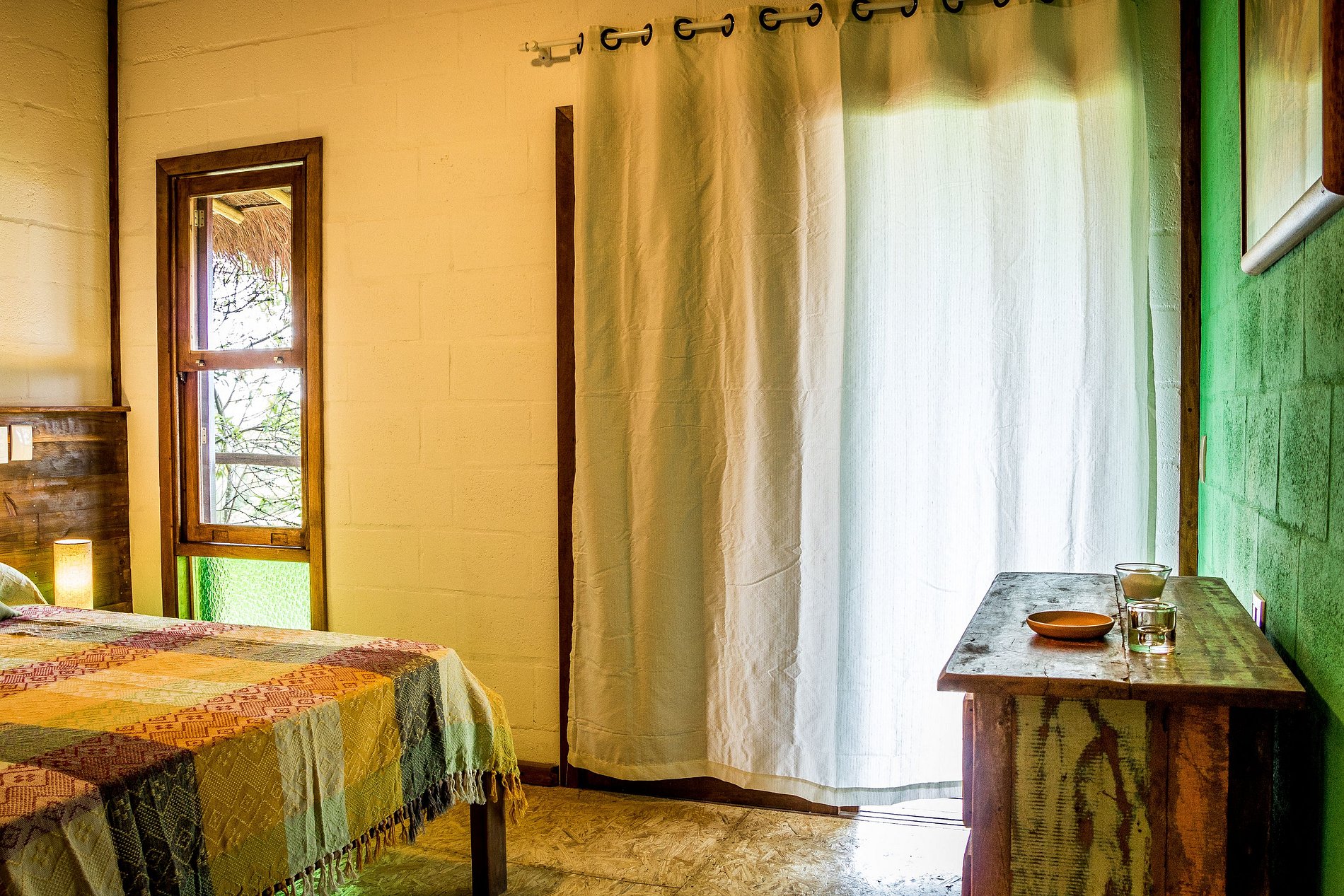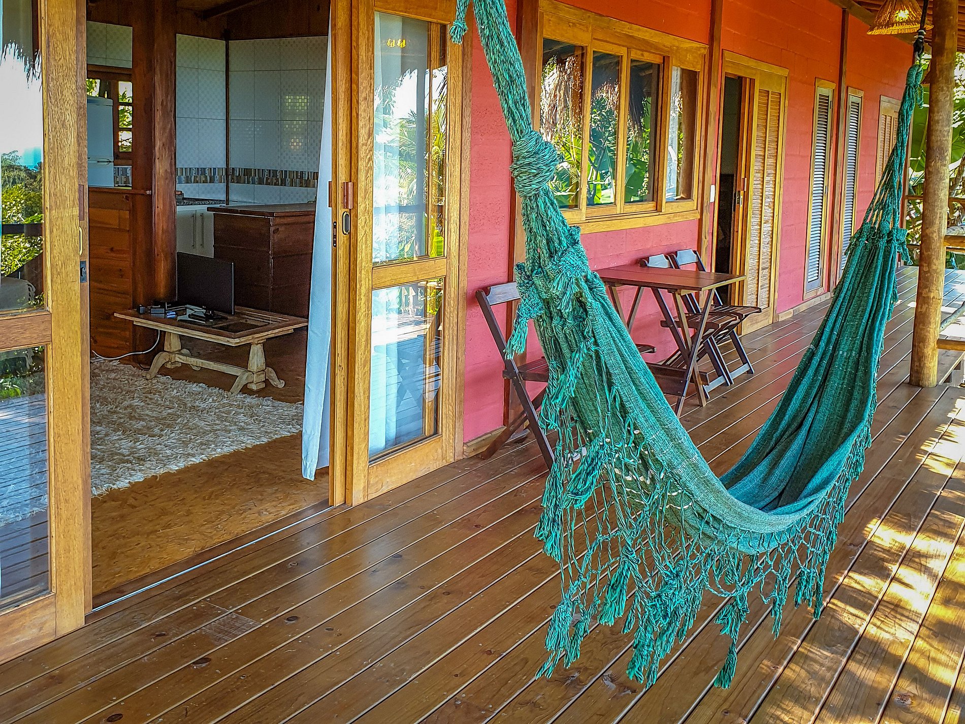 • Arquitetura de madeira, com uma ampla varanda na frente e telhado generoso, para trazer conforto térmico. O Bangalô está completamente imerso na Mata Atlântica, cercado por coqueiros, bananeiras e outras árvores.