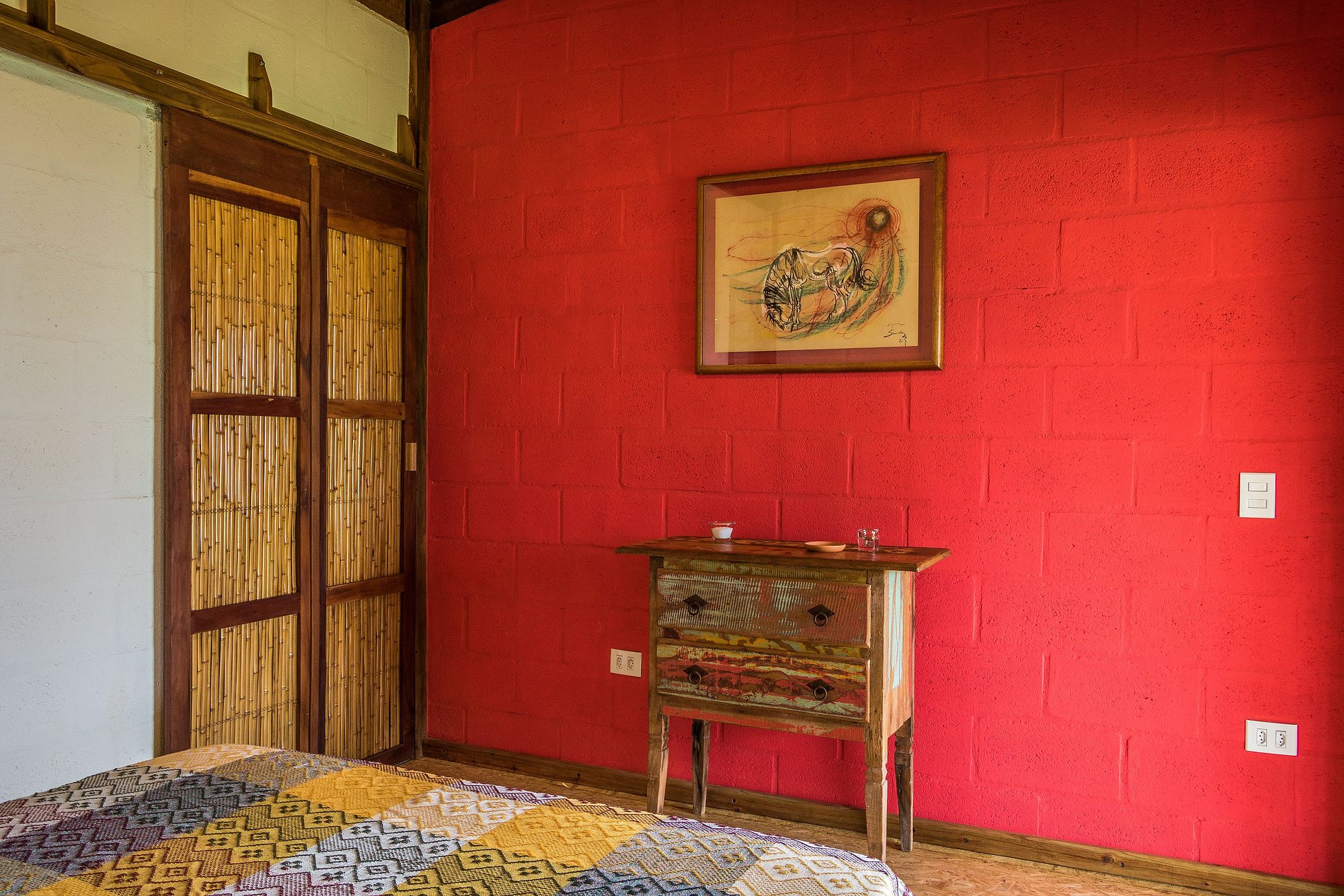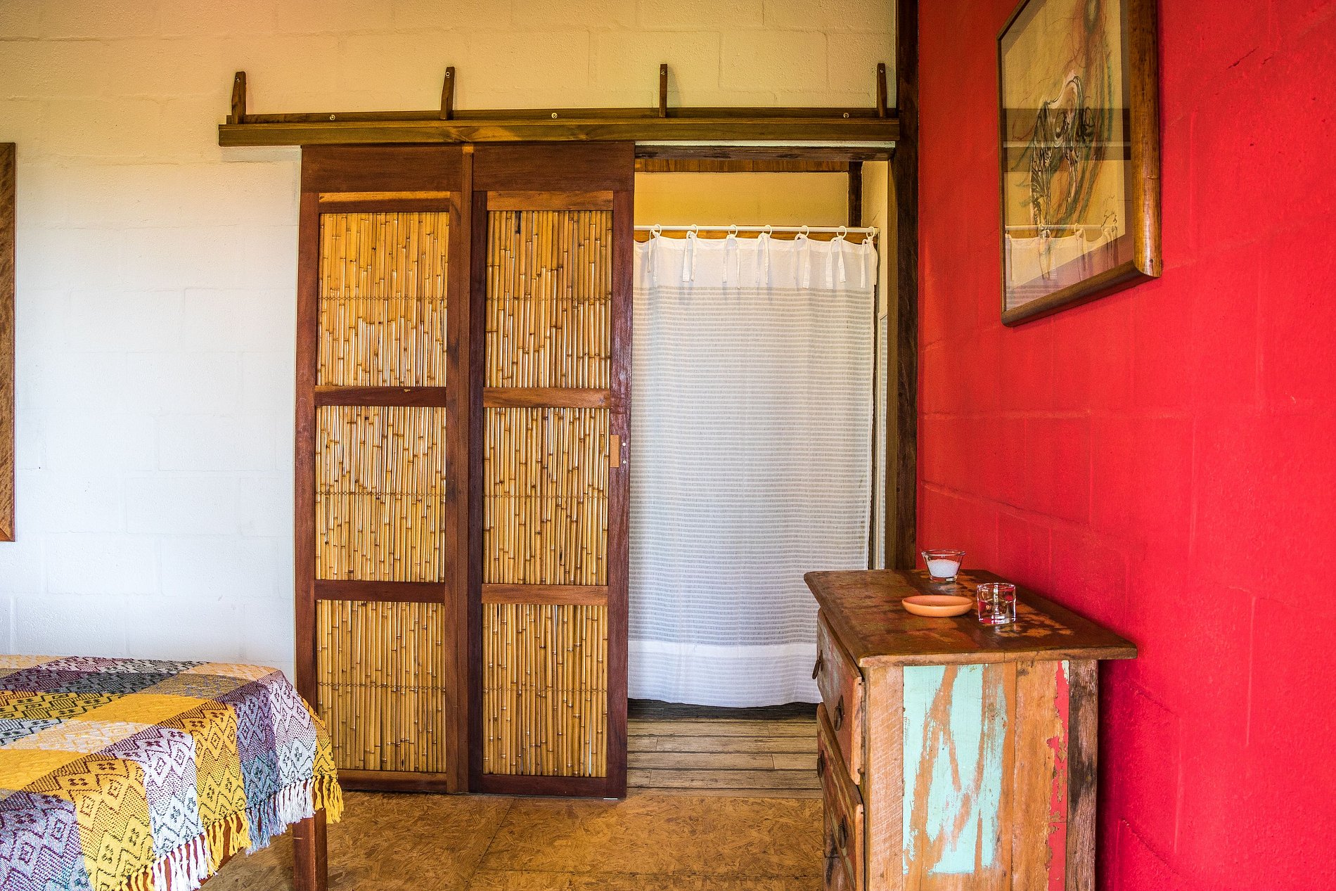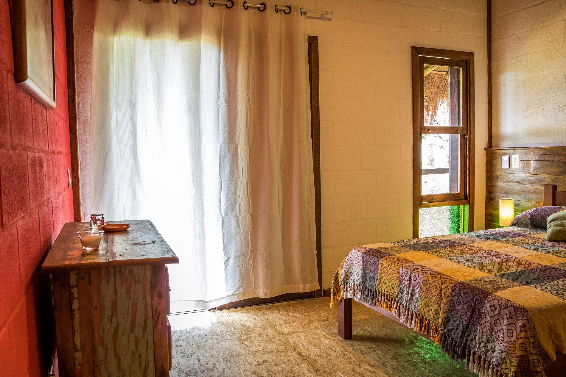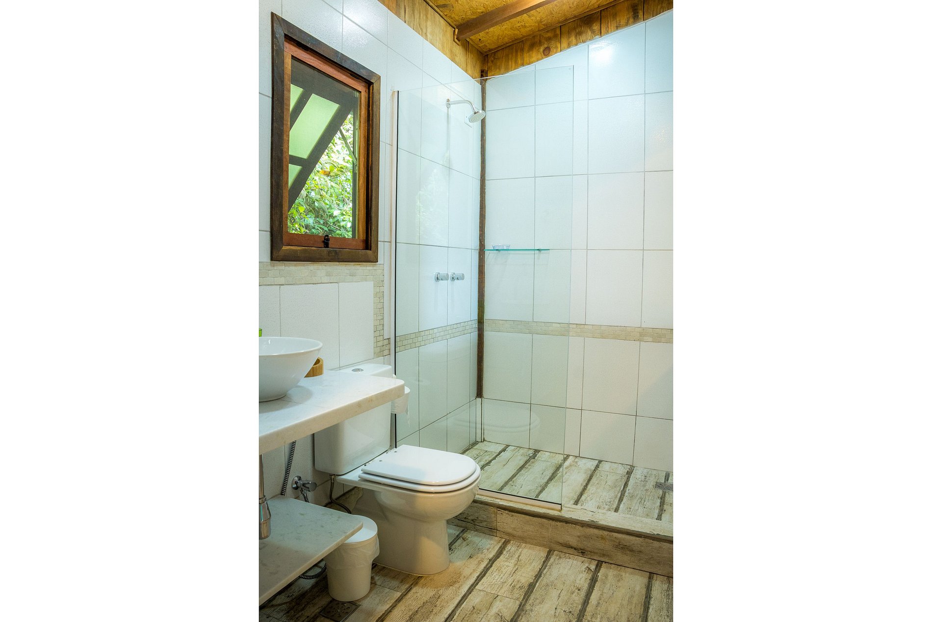 • Arquitetura de madeira, com uma ampla varanda na frente e telhado generoso, para trazer conforto térmico. O Bangalô está completamente imerso na Mata Atlântica, cercado por coqueiros, bananeiras e outras árvores.