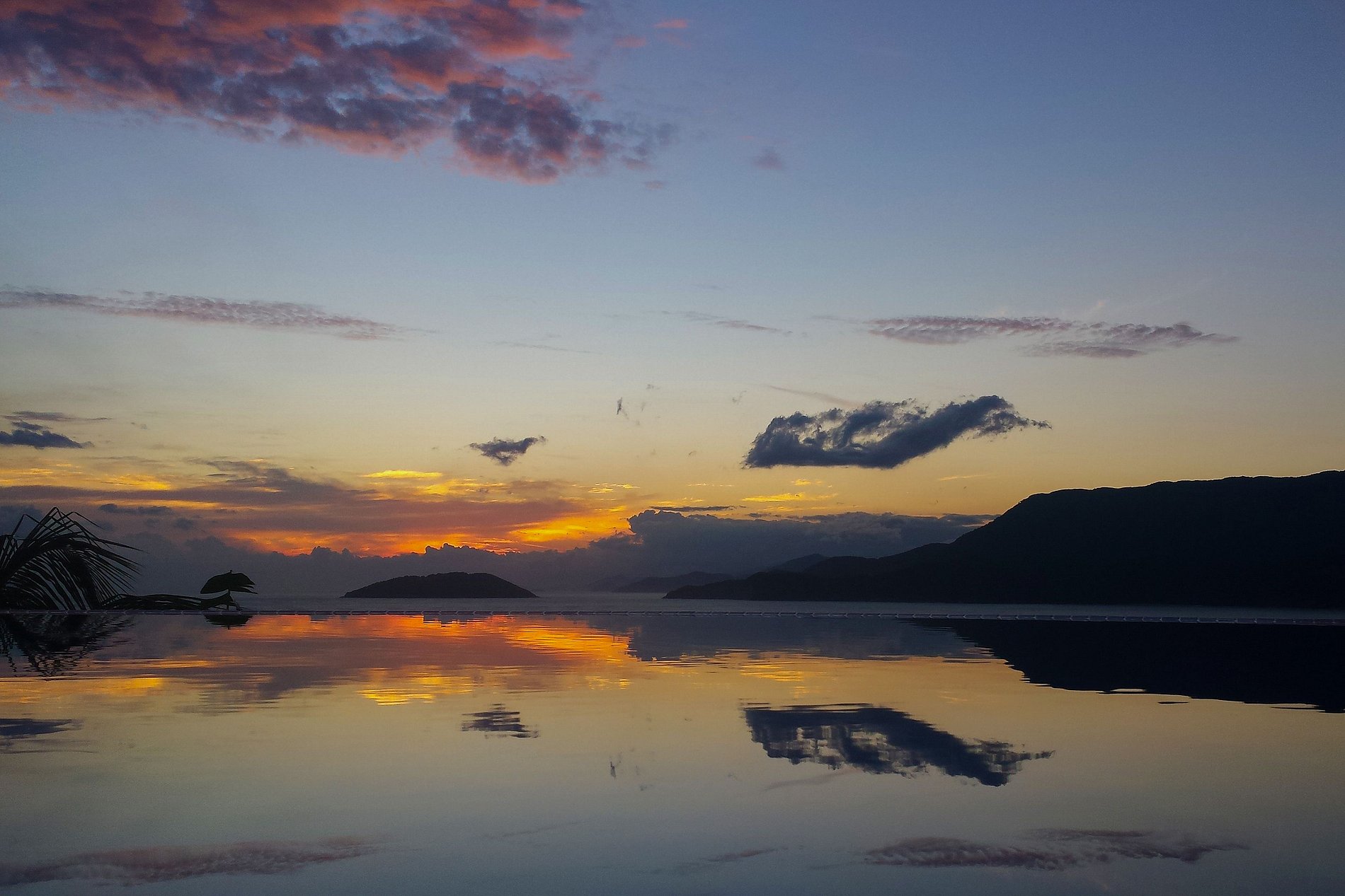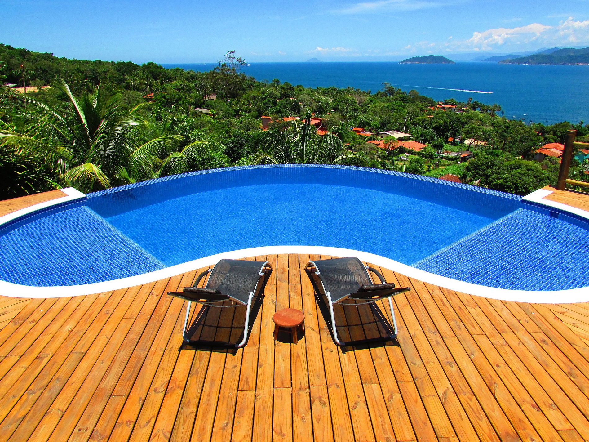 • Possui uma piscina estonteante com fundo infinito, área de deck com mirante, espreguiçadeiras, mesas, cadeiras e ducha, disponível a todos os hóspedes do Bangalô Ilhabela.
