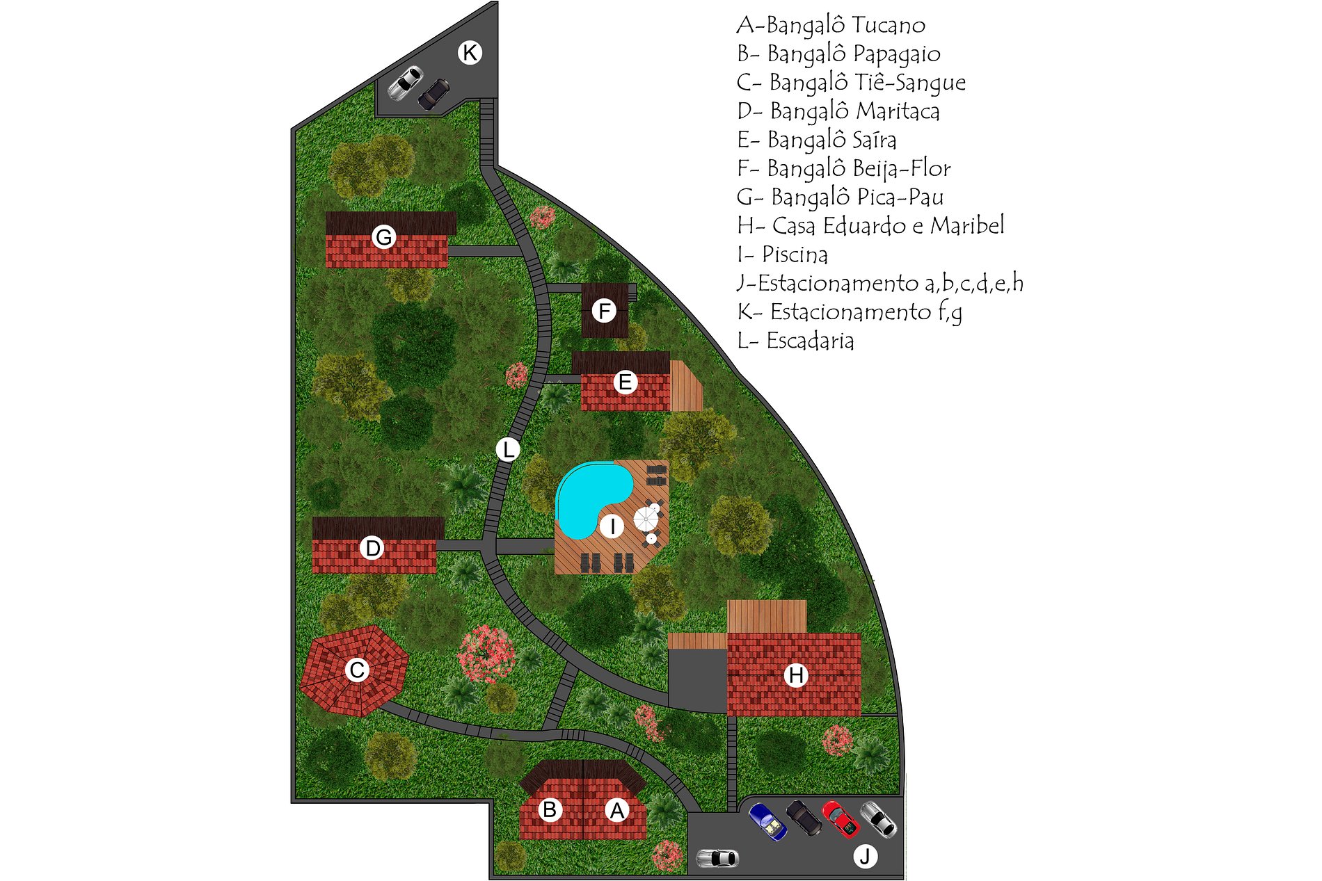 • Todo o espaço foi idealizado e projetado pelos proprietários, visando a tranquilidade, a privacidade entre os bangalôs e a integração total com a natureza.